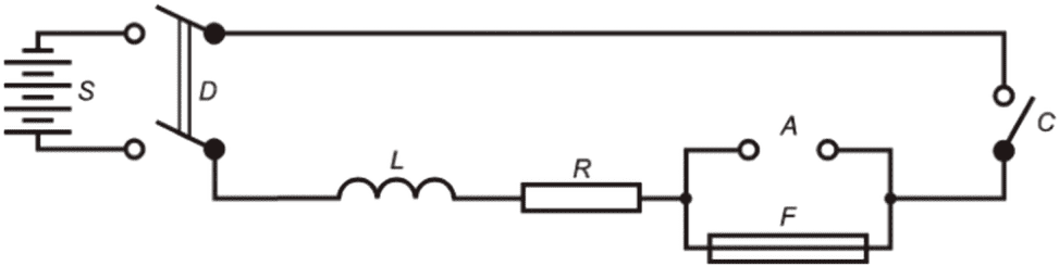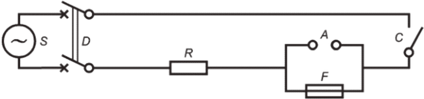 для отключения источника питания; F - испытуемая плавкая