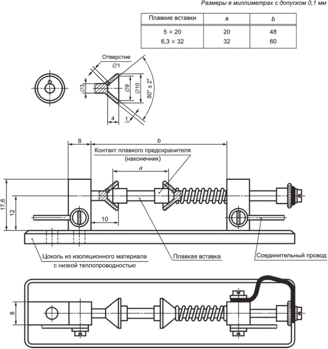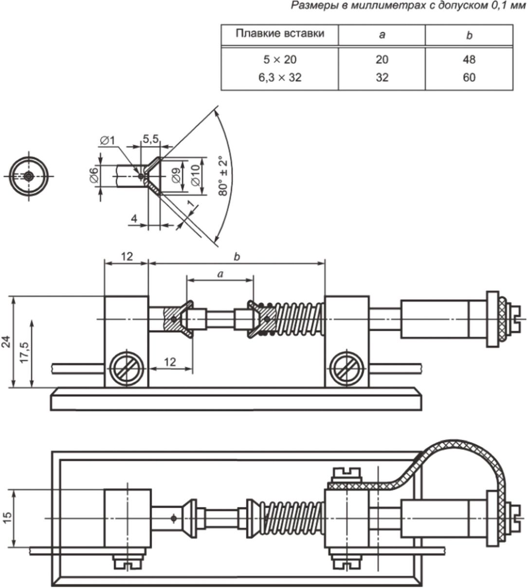 Испытания трубчатых плавких вставок проводят в цоколях для плавких вставок, приведенных на