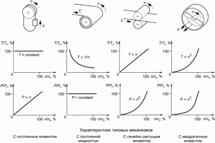 Механические и энергетические характеристики показывают, как момент T или мощность P зависят от скорости n данного механизма. Мощность при этом является произведением момента на скорость вращения.