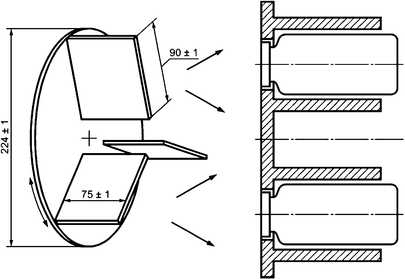 (5.2.1). Размеры лопастей приблизительно 90 x 75 мм, сторона размером 90 мм, ближайшая к горловине банок, проходит от них на расстоянии (10 +/- 5) мм. Вентилятор вращается со скоростью (1400 +/- 100) об./мин, причем направление вращения противоположно направлению вращения вертикально установленного поворотного стола. Общее расположение поворотного стола и вентилятора показано на
