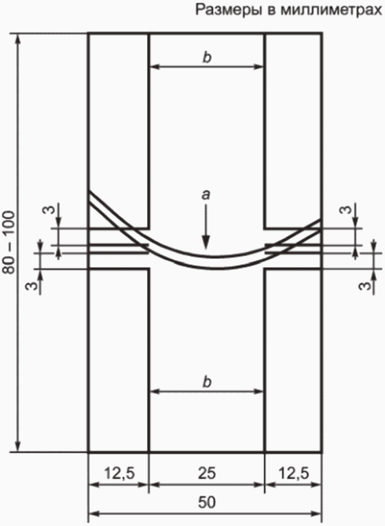 6.2.2.1 Измеряют ширину центральной части испытуемой пробы в мм до ближайшего 0,5 мм и регистрируют значение как