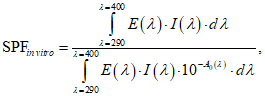 2.2 численное значение SPF, определенное методом in vitro (in vitro calculation of SPF, SPFin vitro): Коэффициент защиты солнцезащитной продукции от солнечного излучения, вызывающего появление эритемы (покраснения кожи), вычисленный при спектральном моделировании.