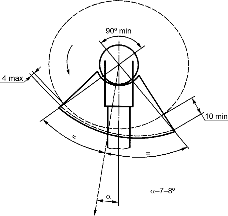 3.2 Радиальный зазор между зубьями режущего полотна и защитным устройством должен быть не более 4 мм при входе полотна в защитное устройство и должен увеличиваться не менее чем до 10 мм при выходе из него