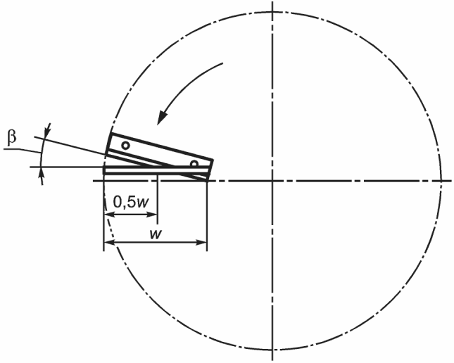(2) режущее оборудование на маховом механизме: Внутренний угол между направляющей поверхностью ножа и линией, параллельной оси вращения (рисунок 2), проходящей через кончик ножа | en | flywheel cutterhead |