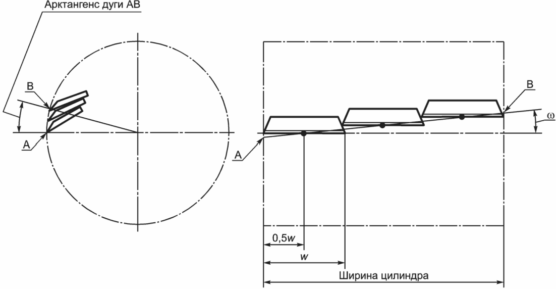 5.21 угол спирали ножа цилиндрического режущего оборудования щ: Арктангенс длины дуги, описанной лезвием ножа, разделенный на ширину цилиндра (рисунок 3). Для режущих аппаратов с несколькими ножами сегментированной ширины длины дуги, описанной линией, проходящей через среднюю точку каждого ножа, разделенной на ширину цилиндра (рисунок 4). Примечание 10 - Угол наклона ножа для режущего аппарата с сегментированным ножом не совпадает с углом наклона для каждого отдельного ножа | en | cylinder cutterhead knife helix angle щ |