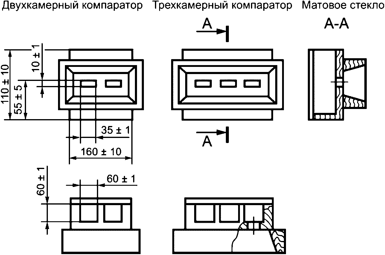 4.5.1 Два стакана помещают в двухкамерный компаратор, имеющий вместо задней стенки матовое стекло, а в передней стенке два одинаковых прямоугольных отверстия, расположенных на уровне половины высоты стаканов.