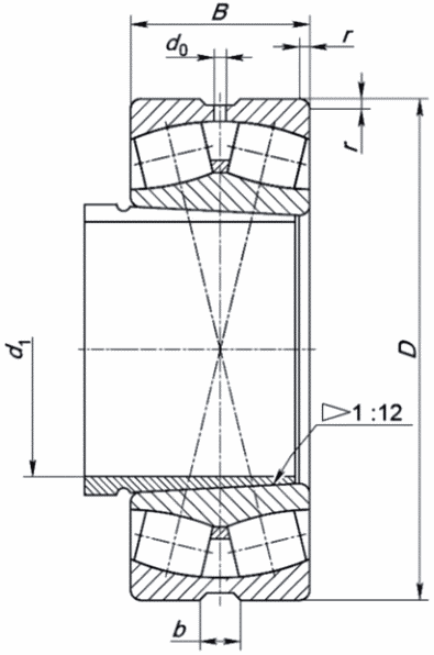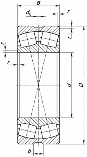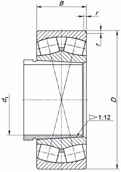 Н | 0, 3 | Со стяжной втулкой конусностью 1:12, с внутренним кольцом без бортиков, с направляющим кольцом, со смазочной канавкой и смазочными отверстиями на наружном кольце | ||