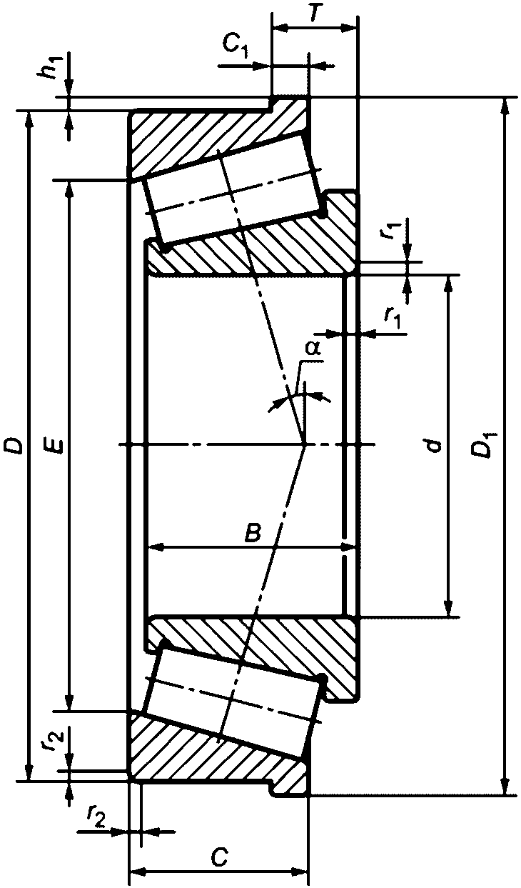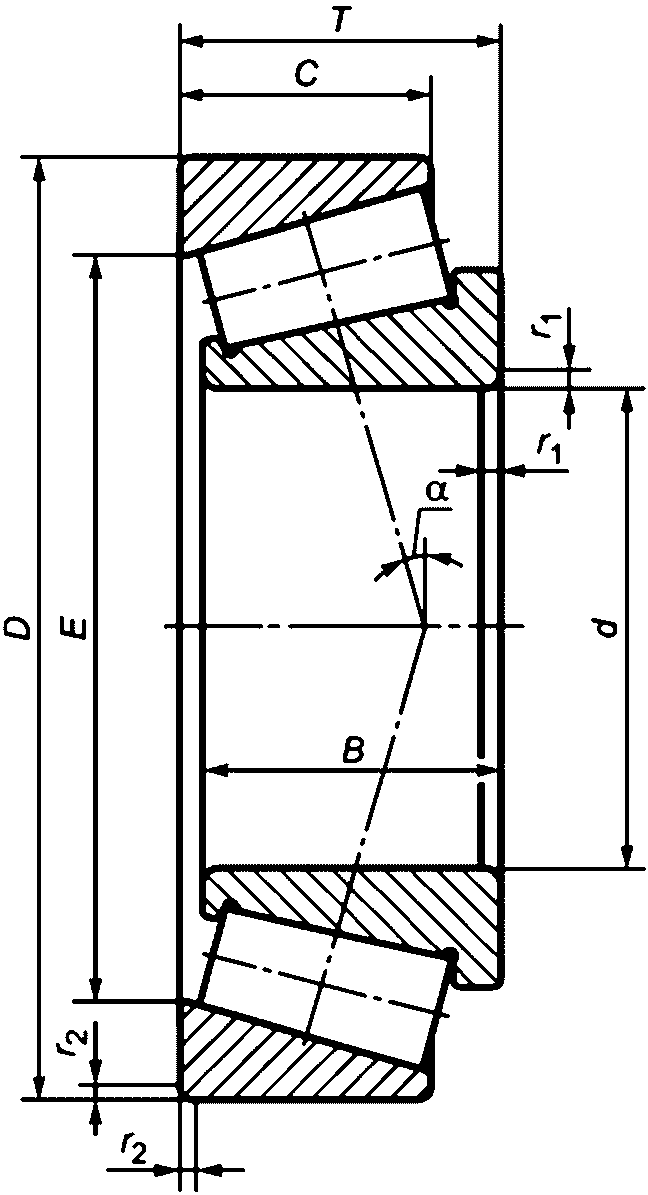 Основное условное обозначение подшипника | d | D | B | C | T | E | r1s min | r2s min | |