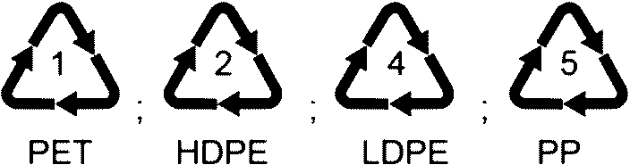 <*> Используют только заглавные буквы. Для маркировки упаковки, изготовленной из материала одного вида, применяют буквенное обозначение и/или цифровой код этого материала. <**> Допускается обозначение упаковки из первичного полиэтилентерефталата маркировать идентификационным кодом "1" как для аббревиатуры "PETE", так и для аббревиатуры "PET" (см. [2]). |