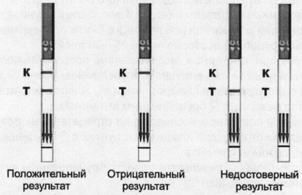 Результаты реакции оценивают по наличию на тест-полосках линий розового цвета в К- и Т-зонах. Реакцию считают: