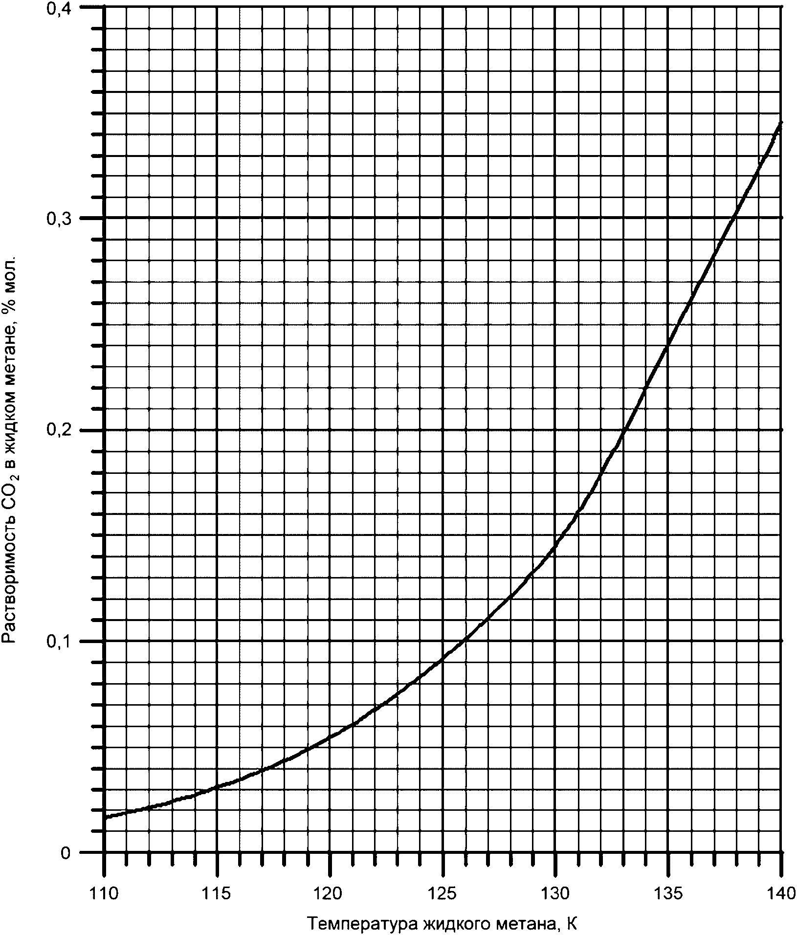 9.4 СПГ следует хранить таким образом, чтобы не допускать образования кристаллической фазы диоксида углерода. Для этого СПГ должен находиться при абсолютном давлении не ниже, чем давление насыщенных паров метана, соответствующее температуре, которая выше на 10 К температуры растворимости диоксида углерода в жидком метане. Молярную долю диоксида углерода определяют при испытании партии СПГ по