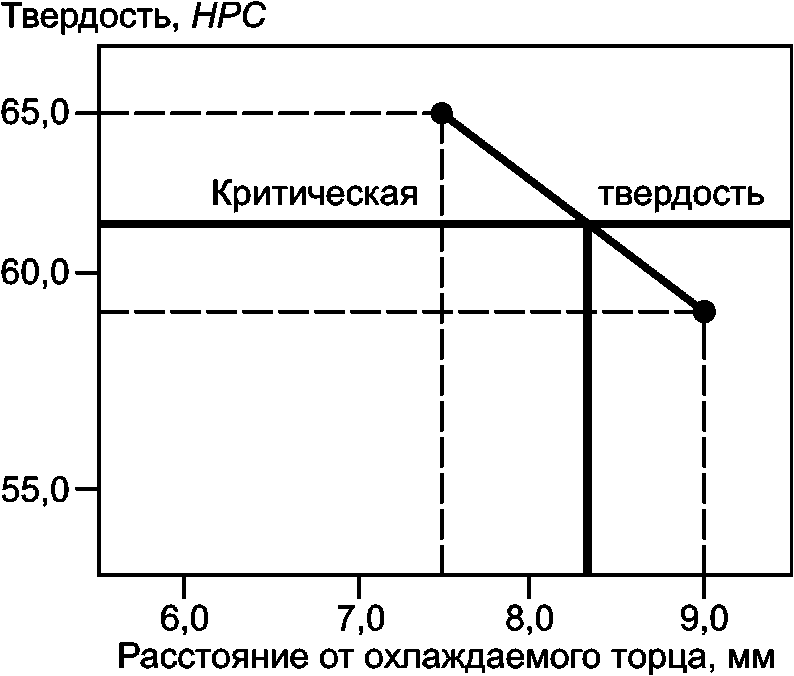 Аналогичный результат был бы получен и при расчете положения точки с глубиной прокаливаемости 61 HRC, если его произвести от точки с прокаливаемостью менее критической. В этом случае необходимо не прибавлять, а вычитать расчетное расстояние, соответствующее градиенту твердости. Для приведенного выше примера расчет имел бы следующий вид: