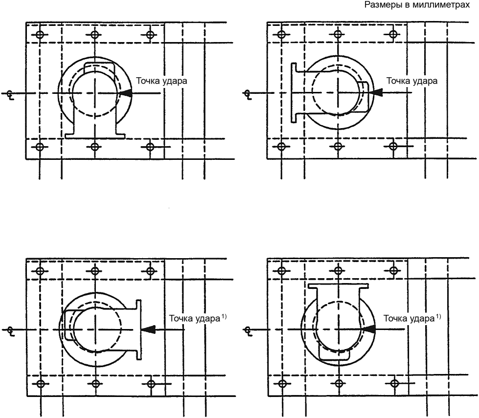 b) ударная нагрузка должна прилагаться на испытуемый клапан в плоскости, перпендикулярной осевой линии монтажного фланца цистерны в каждом из 4 положений вращения, как показано в