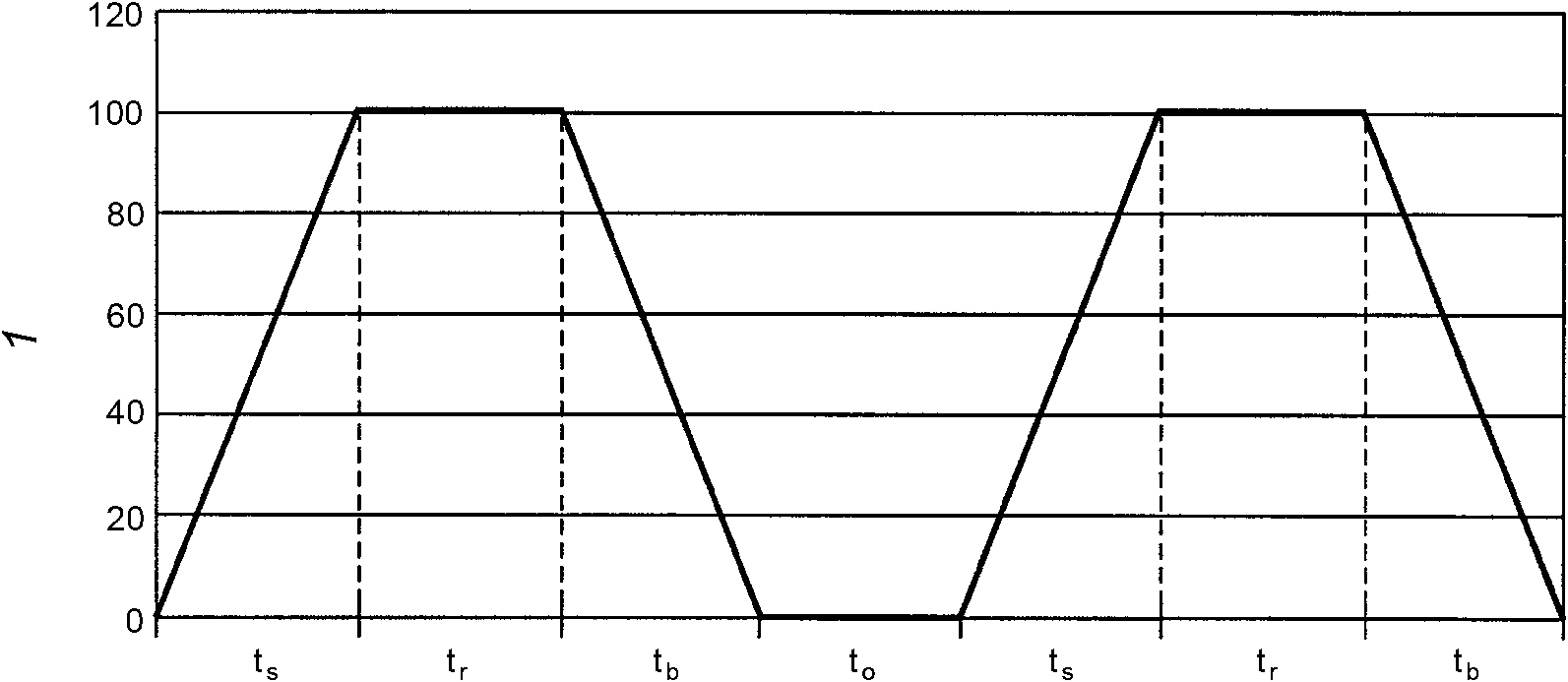 Если общее время одного цикла - tc, то tc = ts + tr + tb + to. Время испытательного цикла для режимов "Вкл." (ts + tr) и "Выкл." (tb + to) определяется изготовителем, но оно не должно превышать 100 с для режима "Вкл." и 20 с для режима "Выкл.".