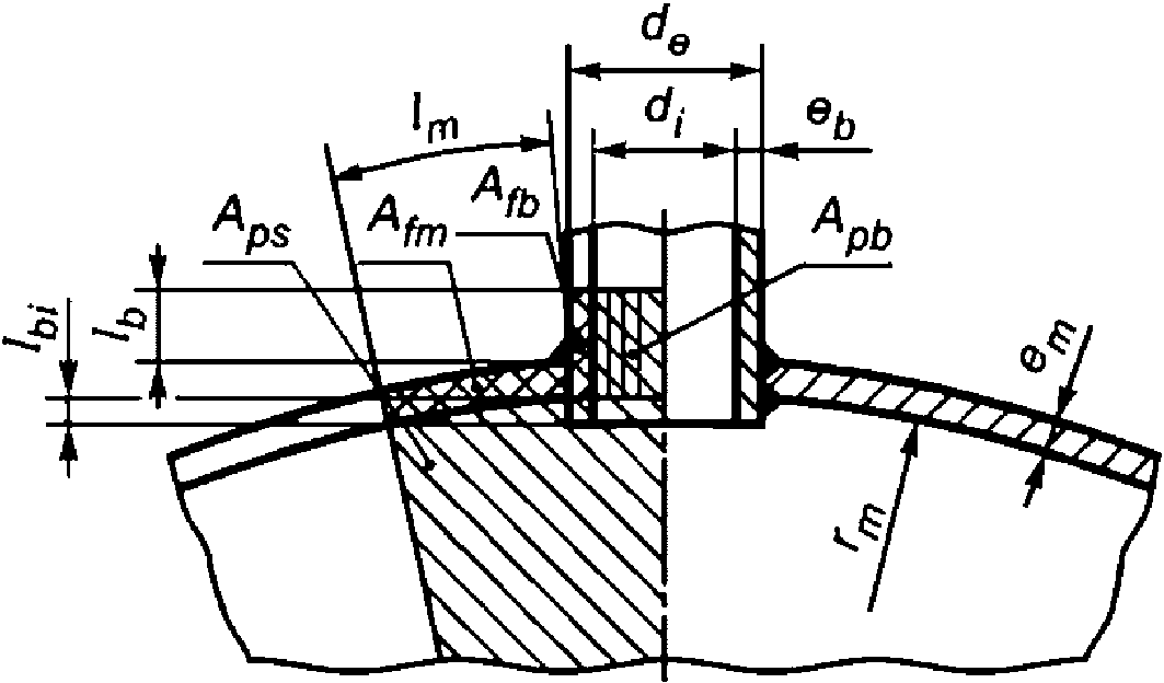 <a> Расчетная температура T = 20 °C и расчетная нагрузка [( pvap - 1 бар) + pdyn] не применяется. <b> С  согласно EN 13445-3:2014 и коэффициентом запаса прочности S = 1,1 согласно 6.4.3. <c> С тремя элементами жесткости из полосовой стали 46 x 8; l = 1 368 мм. <d> С  согласно EN 13445-3:2014 и коэффициентом запаса прочности S = 1,1 для условий испытаний. <e> С  согласно EN 13445-3:2014 и коэффициентом запаса прочности S = 1,5 для рабочих условий. |