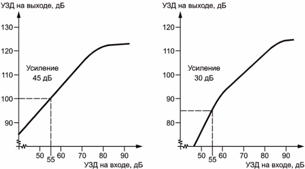 Примечание 1 - Усиление определяется при акустическом уровне звукового давления (УЗД) на входе 55 дБ или (для индукционных приемных катушек) при уровне напряженности магнитного поля относительно 1 А/м, равном минус 35 дБ, что является магнитным эквивалентом значения УЗД 55 дБ.
