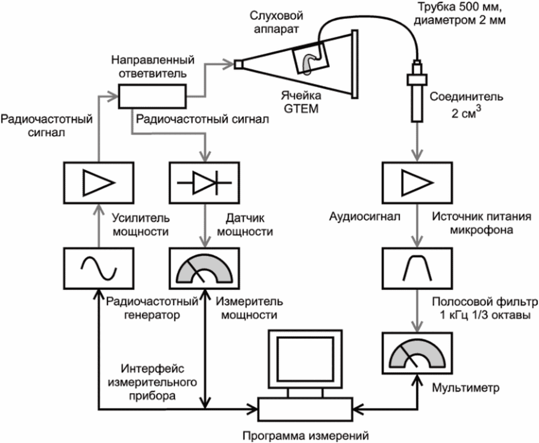 Вначале слуховые аппараты были испытаны акустически в соответствии с IEC 60118-0. Чтобы металлический имитатор уха можно было удалить из радиочастотного поля, соединение между слуховым аппаратом и имитатором уха было модифицировано с помощью трубки длиной 500 мм. Наблюдались относительно большие вариации акустического эффекта этой модификации. Это означает, что для отдельного испытуемого слухового аппарата при определении OIRIL должно быть измерено усиление слухового аппарата.