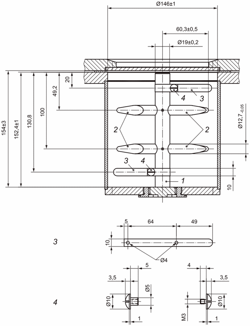 рисунок 1 - допуск на все размеры составляет +/- 0,5 мм, если не указано иное). Устройство должно быть способно поддерживать непрерывное поступательное движение испытуемых проб (для того, чтобы не допустить застревания во время испытания). Эта способность может быть обеспечена либо воздушной струей (которая подается на стенку цилиндра), либо пластиковыми лопастями (установленными на вал, см.