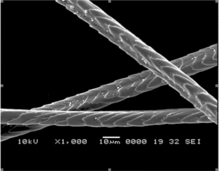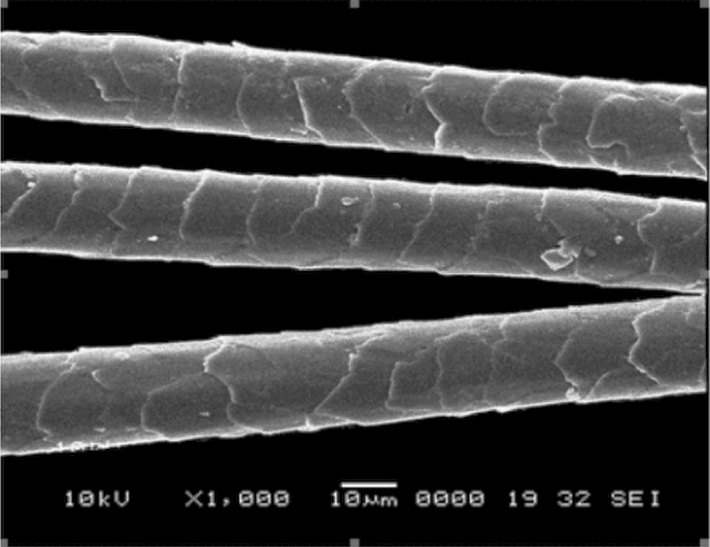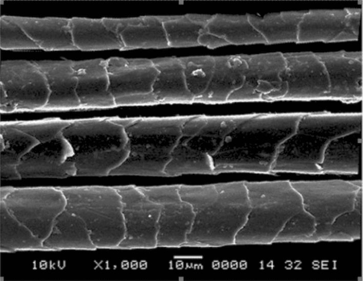 B.60. Волокна обладают большей равномерностью диаметра в их продольном направлении, чем волокна шерсти из Австралии такого же диаметра. Чешуйки характеризуются большим разнообразием мозаичного или сетевидного расположения, большой высотой. Поверхность волокон грубая, с плохим блеском. Очевидны рубчатое строение волокна и углубления, частичное отделение чешуек от ствола волокна.