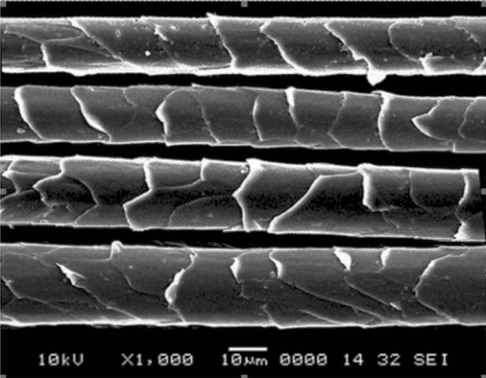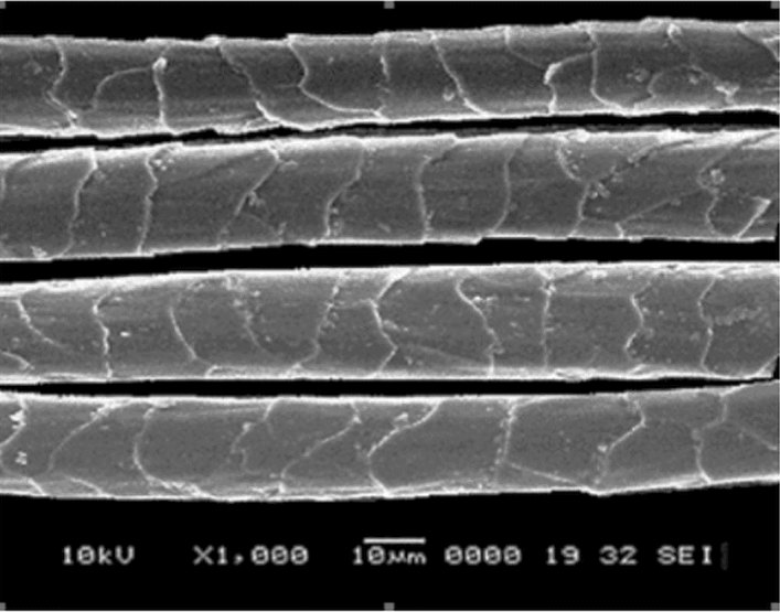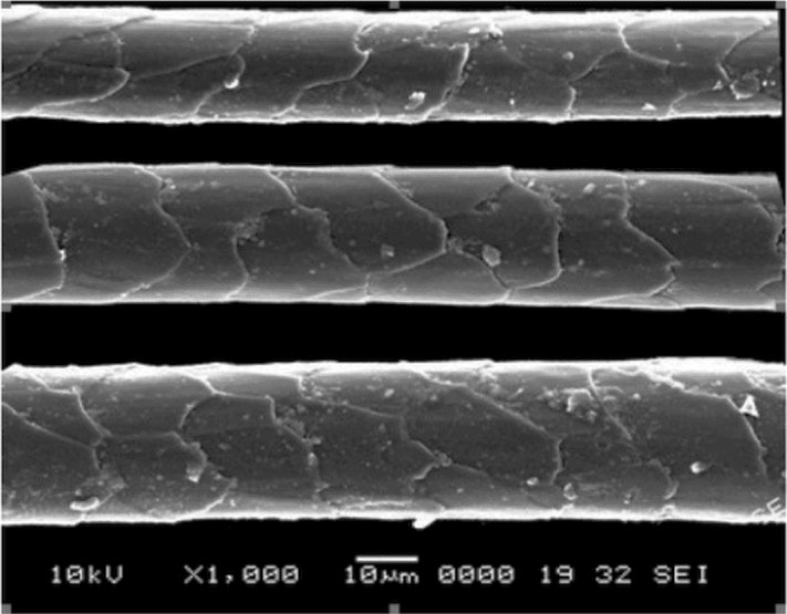 Противоусадочная обработка включает обработку вспомогательными (полимерными) составами и окислителями; наиболее часто используемым является последний метод. На рисунках показана типичная чешуйчатая структура безусадочной и мерсеризованной шерсти. Два типа чешуйчатой структуры одновременно имеются в целых партиях как безусадочной, так и мерсеризованной шерсти.