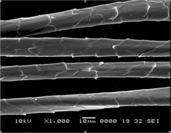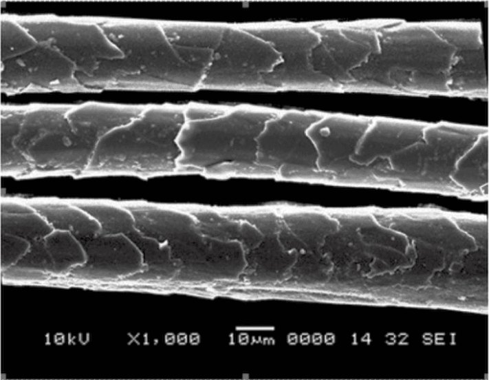 B.53. Волокна обладают большей равномерностью диаметра в их продольном направлении, чем волокна шерсти из Австралии такого же диаметра. Самая тонкая шерсть (с диаметром волокон менее 13 мкм) имеет низкую частоту чешуек неправильной формы. Для более грубой шерсти характерны мозаичное или сетевидное расположение чешуек с грубой поверхностью и плохим блеском, большой угол отклонения чешуек от ствола, частичное отделение чешуек от ствола волокна.