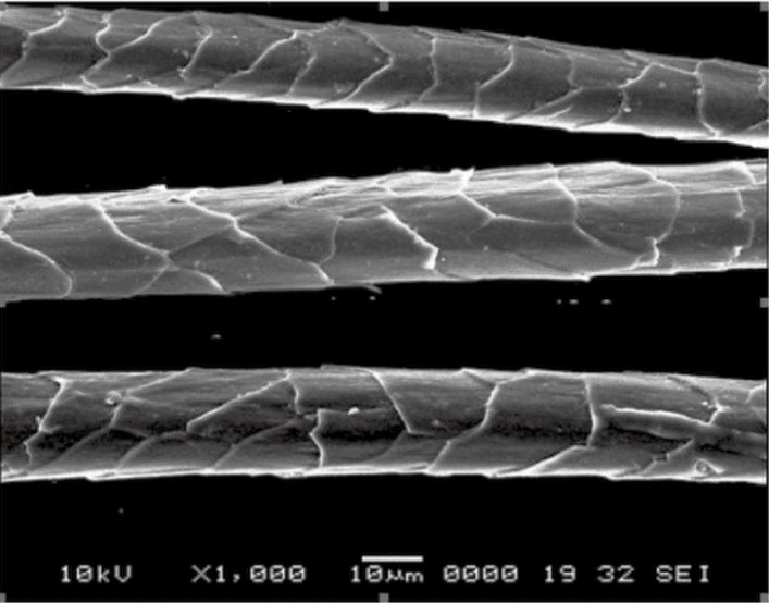 Волокна кроличьей шерсти имеют отличающуюся структуру волокна, поэтому их легко распознать среди других волокон.