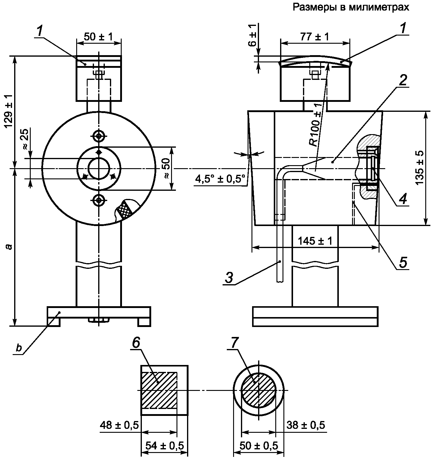 Устройство должно иметь цилиндрическую форму с горизонтальной осью, длиной (145 +/- 1) мм между центрами торцевых поверхностей. Диаметр цилиндра должен быть (135 +/- 5) мм. Плоскости каждой торцевой поверхности должны находиться под углом 4,5° +/- 0,5° по отношению к вертикальной плоскости.