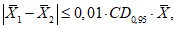 9.3.3 Вычисляют разность между двумя средними значениями, полученными в двух разных лабораториях и рассчитанными по двум результатам определений, полученным в условиях повторяемости, и сравнивают ее с допускаемой разностью CD0,95 по формуле