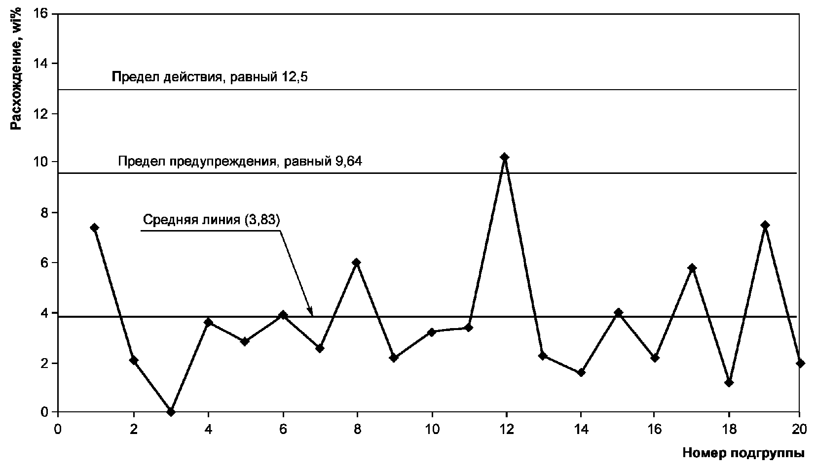 Карта, приведенная на рисунке В.1, свидетельствует, что результаты измерений не являются стабильными, так как имеется одна точка выше предела действия. Поэтому для расчета параметров контрольной карты пределов для следующего периода значение стандартного отклонения промежуточной прецизионности SI(TO) вычисляют после исключения подгруппы 5. Новое значение SI(TO) (для 19 подгрупп) составляет 5,12%. Параметры контрольной карты пределов для следующего контрольного периода соответственно составят: