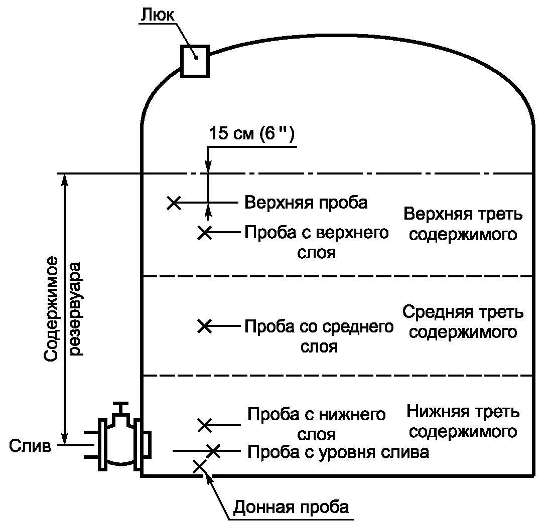 2.1.6. Промежуточная проба (clearance sample): точечная проба, взятая с помощью открывающегося пробоотборника с уровня на 10 см (4 дюйма) (в некоторых случаях по требованию заинтересованных сторон - на 15 см (6 дюймов)) ниже сливного отверстия резервуара.