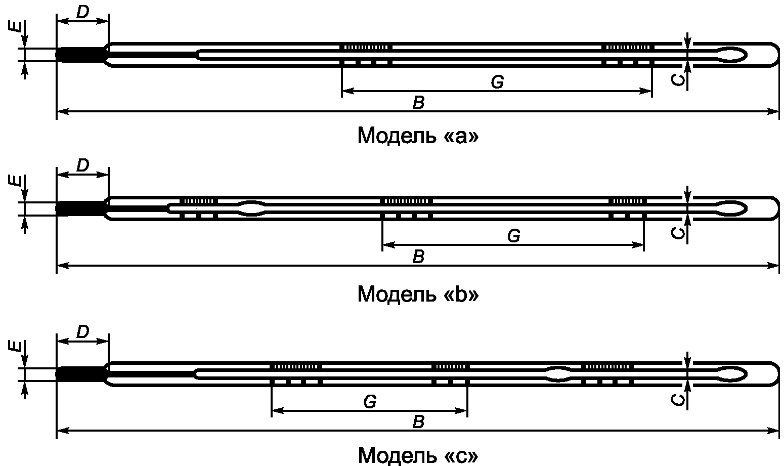 Примечание - Разница в конструкции главным образом основывается на положении точки замерзания воды. В модели "a" точка замерзания воды находится в диапазоне шкалы; в модели "b" - ниже диапазона шкалы; в модели "c" - выше диапазона шкалы (рисунок Г.1).