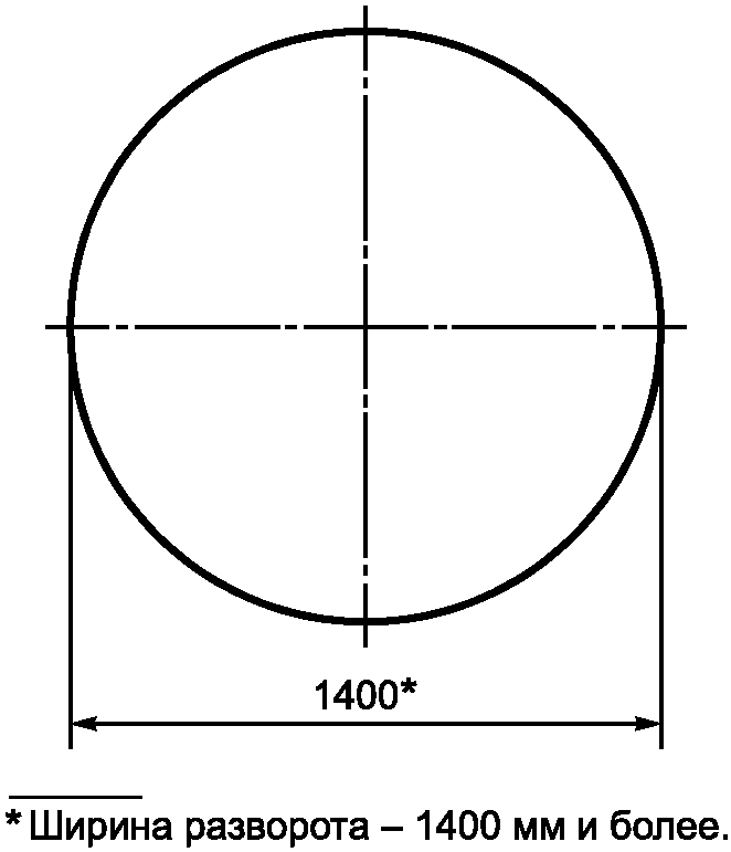 5.3 Параметры свободной площади для разворота кресла-коляски (с инвалидом) в санузле | | По плоскости пола - параметры геометрической фигуры, расположенной между вертикальными плоскостями стен или вертикальными поверхностями, проходящими по выступающим частям оборудования, ограничивающего перемещение кресла-коляски на высоте от 50 до 220 мм от пола. Требование считается выполненным, если в измеренную геометрическую фигуру вписывается круг диаметром 1400 мм |