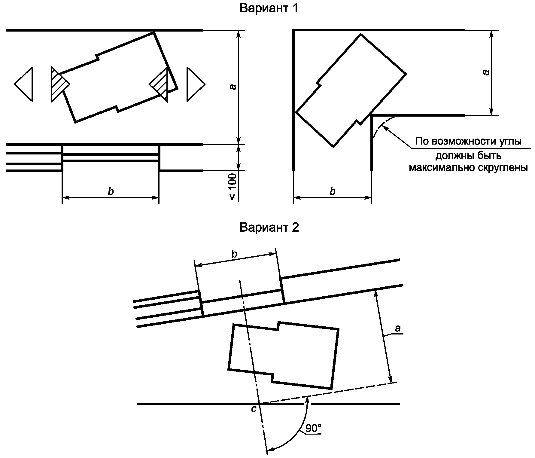 3.3.2 Ширина прохода (коридора) для проезда кресел-колясок от входной двери к месту размещения | | По плоскости пола между стенами или вертикальными плоскостями, проходящими по наиболее выступающим в проход элементам поручней, ручек, стоек (иного оборудования), расположенным на высоте от 400 до 700 мм от пола (при их наличии). Измерение проводится на всех участках прохода, отличающихся по ширине. Примечание - При контроле соответствия ширины коридора с непараллельными стенами размеру a [ рисунок А.1, вариант 2 (приложение А)] проверяют отсутствие препятствий, уменьшающих ширину коридора (относительно размера a) в зоне маневрирования у входных дверей в купе и туалет, по длине коридора от точки c, указанной на рисунке А.1 (вариант 2), на расстоянии не менее величины b |
