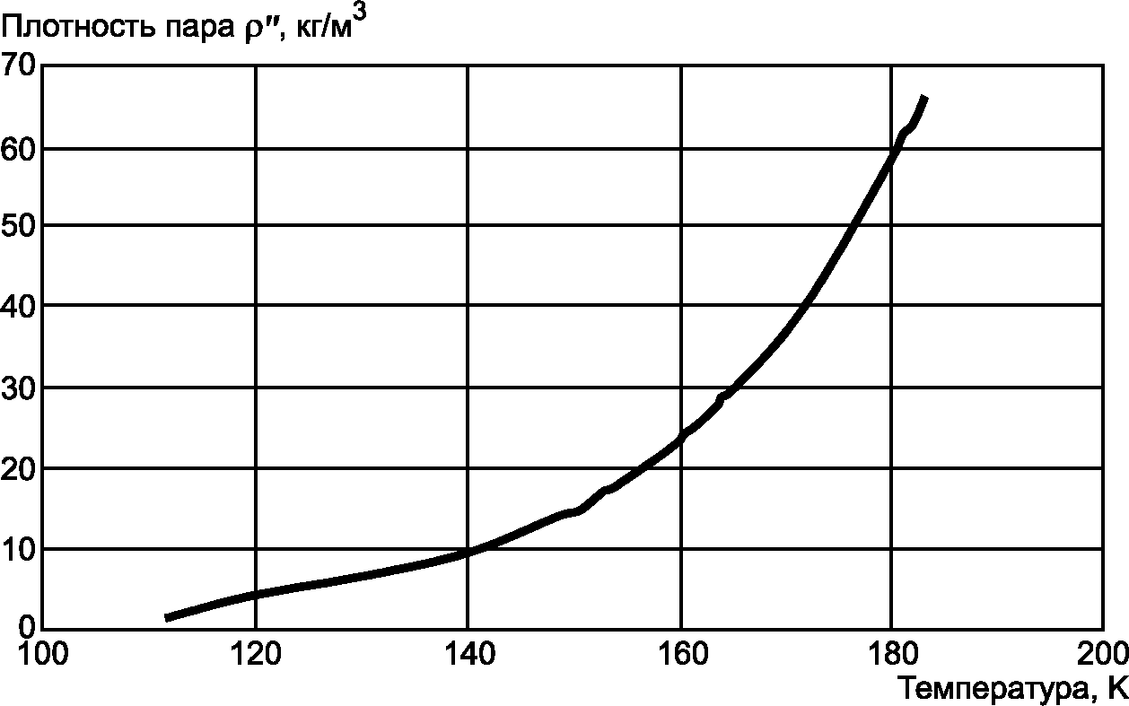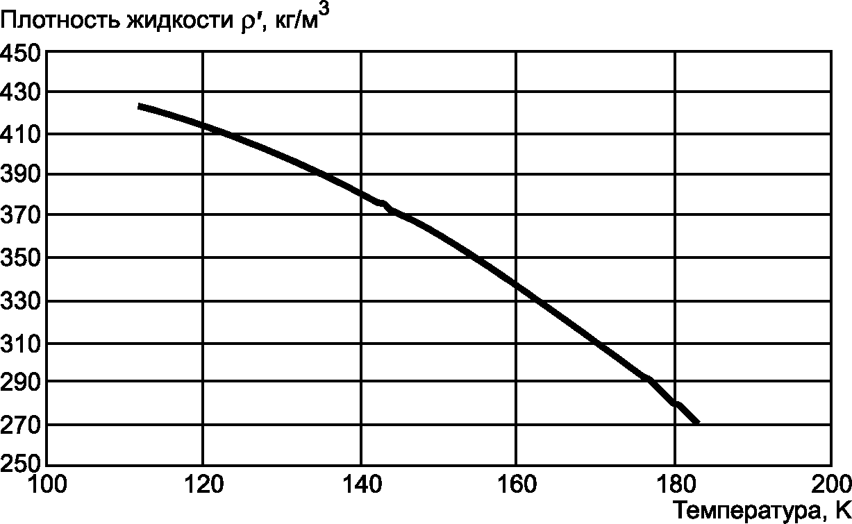 По рисунку А.1 определяем значение температур, равновесных давлению заправки (0,1 МПа) и рабочему давлению (1,0 МПа). Имеем TS = 111 K и TS = 148 К. По рисунку А.2 определяем плотности жидкости при 111 К и 148 К, соответственно