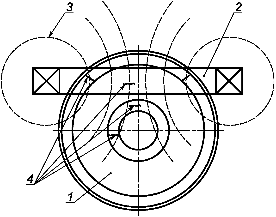 1 - цельнокатаное колесо; 2 - электромагнит; 3 - проводник;