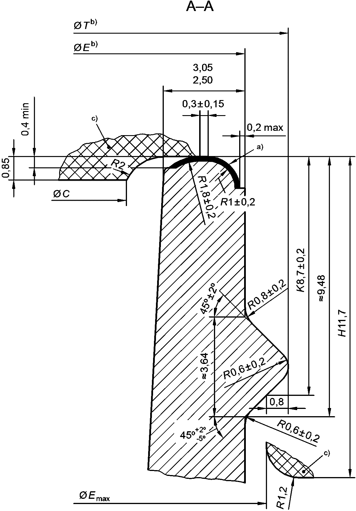 <a> поверхность под укупорку не должна иметь дефектов, которые влияют на герметичность; <b> овальность диаметров должна быть минимальной и соответствовать требованиям документации по стандартизации на стеклянную упаковку и на укупорочные средства. Диаметры E и T должны быть концентрическими относительно друг друга; <c> заштрихованный крестообразно фрагмент поверхности укупорочного средства (диаметра C и высоты H) показывает позицию крышки в закрытом положении. Диаметр Emax относится к диаметру укупорочного средства