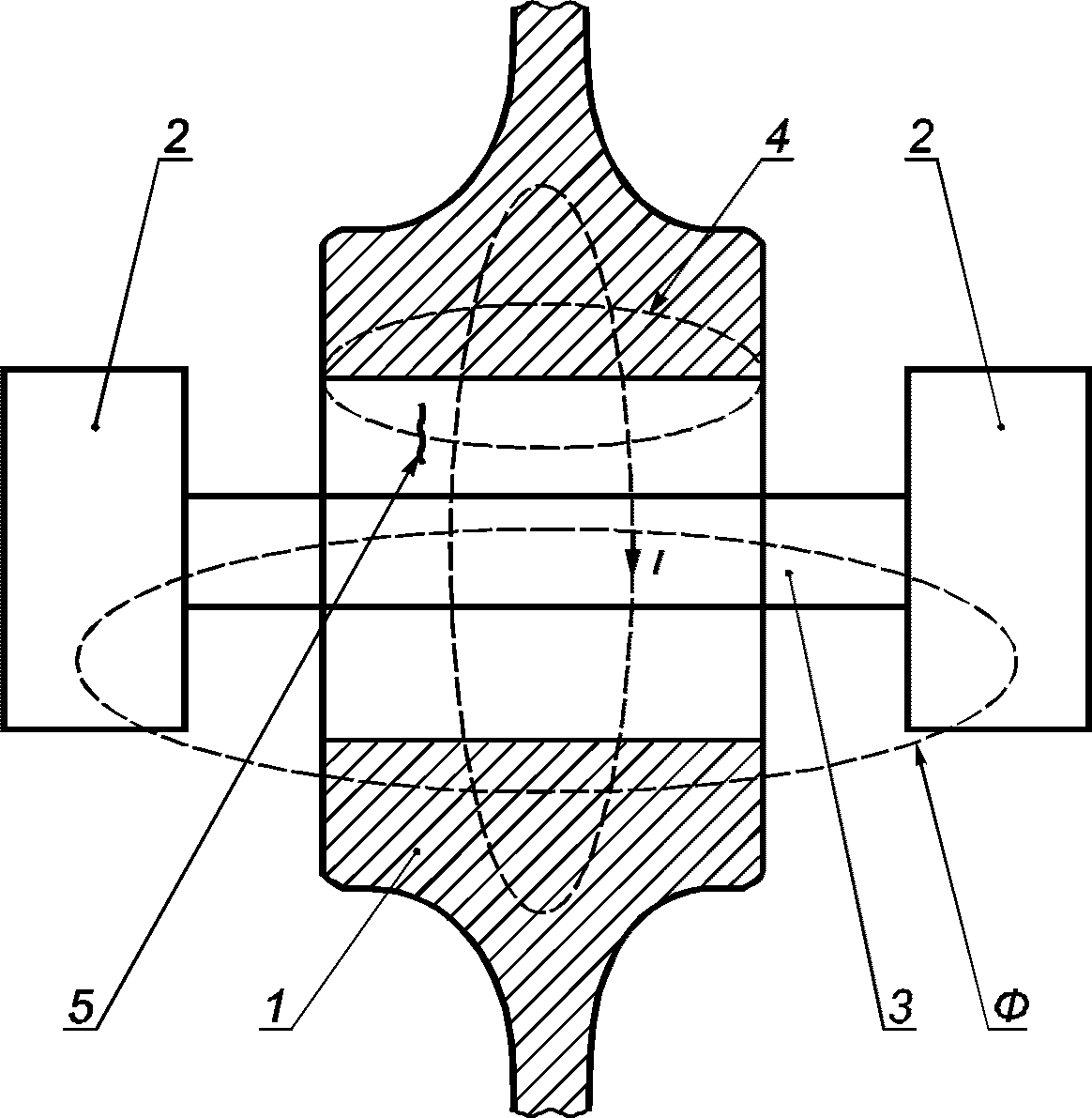 Циркулярное намагничивание чистового катаного колесного центра путем индуцирования тока в объекте проводят по схеме, приведенной на