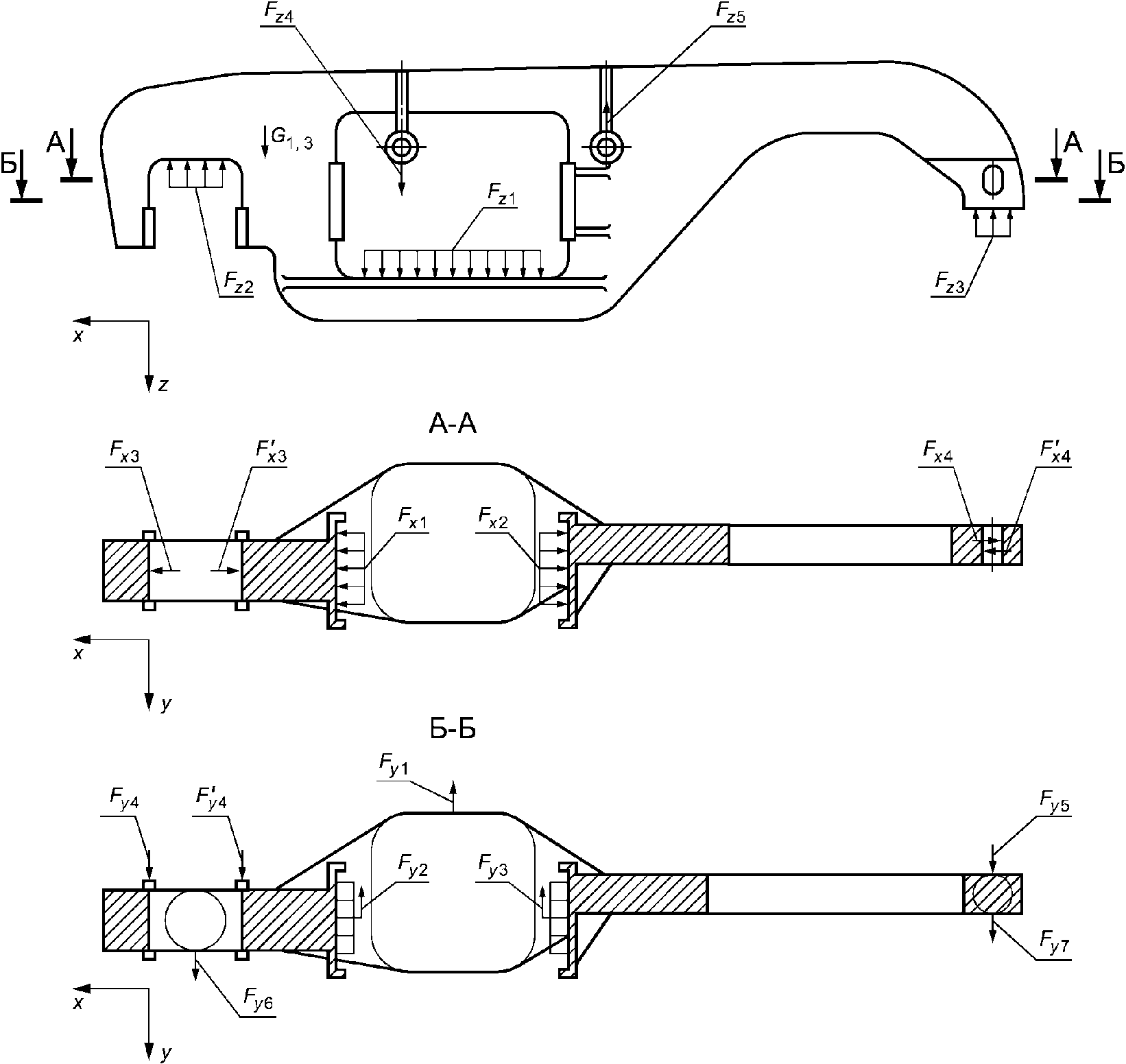 Г.1.3 Силы Fz2, Fz3 действуют в вертикальном направлении на рабочие поверхности боковых скользунов постоянного контакта, расположенных на соединительной балке.