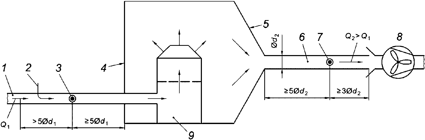 Расход воздуха Q1, подаваемого в систему очистки воздуха, и расход воздуха Q2, выходящего после очистки, должны оставаться постоянными при испытании в заданных условиях. Поперечное сечение камеры должно быть выбрано в соответствии с требованиями системы очистки воздуха.