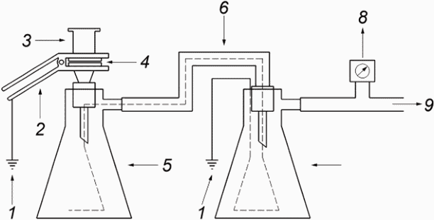 (5.1). Проверяют отсутствие пузырьков на фильтре и надежно фиксируют его между заземленными поверхностями фильтровальной установки.