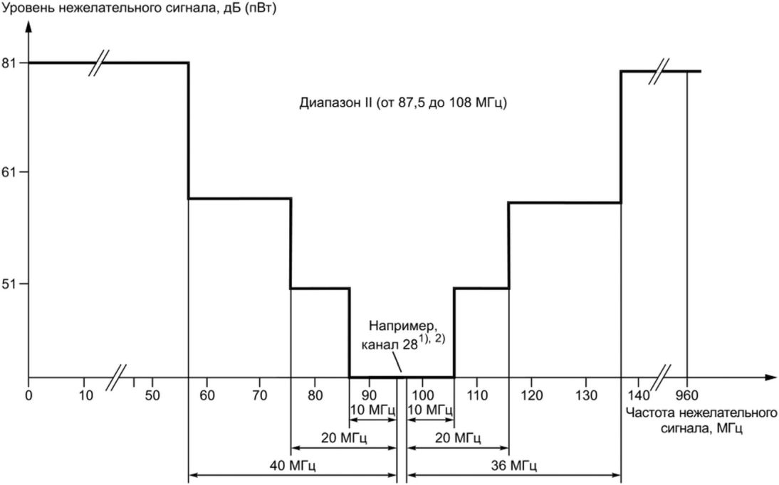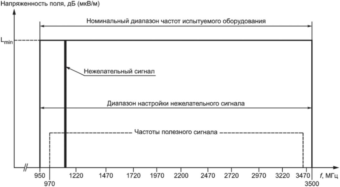Примечание 2 - Для более высокой напряженности поля, превышающей 120 дБ (мкВ/м), в диапазоне частот от 790 до 862 МГц вследствие услуг беспроводной связи, расчет должен быть следующим: 120 дБ (мкВ/м) минус коэффициент связи 25 дБ (при 800 МГц) и эффективность экранирования в 85 дБ для оборудования класса A, что в итоге приводит к уровню нежелательного сигнала в 20 дБ (мкВ/м). Учитывая отношение минимального радиочастотного сигнала к сигналу помехи в 35 дБ для цифровых модулированных сигналов, уровень полезного сигнала должен быть равен 55 дБ (мкВ/м), что является сопоставимым со средним значением полезного сигнала, установленного для активного оборудования в