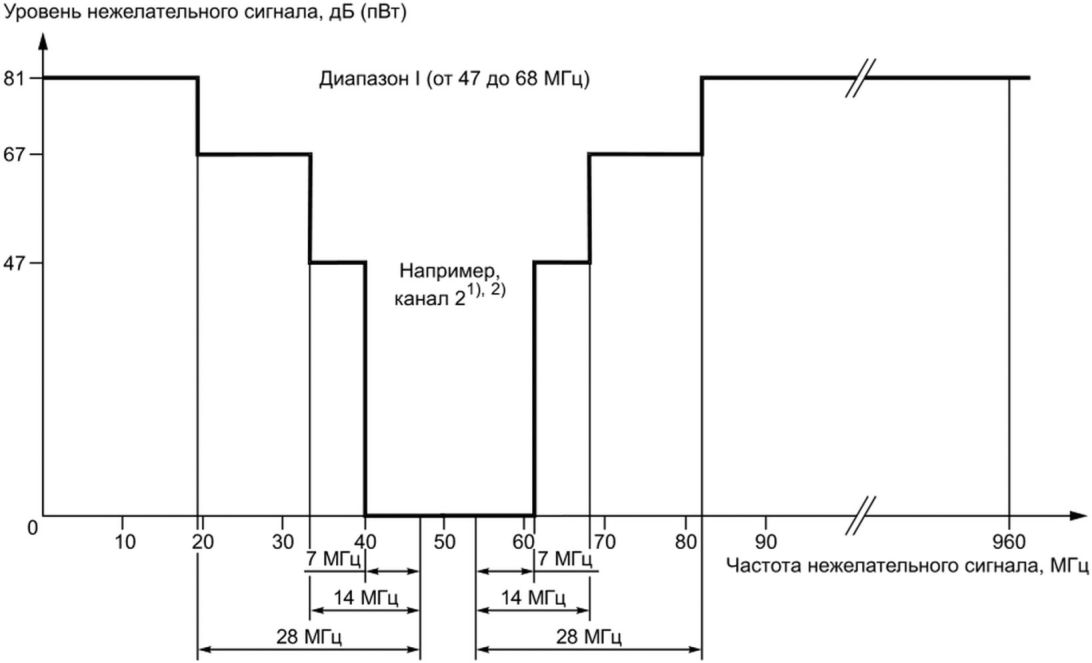 Помехоустойчивость к сигналам зеркальной частоты | Внешние устройства для приема и конверсии FM- и TV-сигналов с частотой выходного сигнала в SAT-IF-диапазоне | | См. EN 61079-1:1993 (пункт 3.10) | |