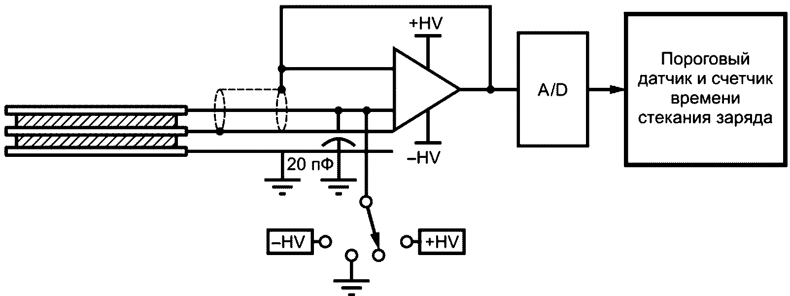 Если общая емкость испытательной цепи, включая пластину, равна 20 пФ +/- 10%, за V будет удобно принять напряжение, равное 100 В. Напряжение 100 В на проводящей пластине емкостью 20 пФ приводит к заряду, равному 2 нКл на пластине. Стандартный кулонометр может измерить этот уровень заряда с точностью 5%.