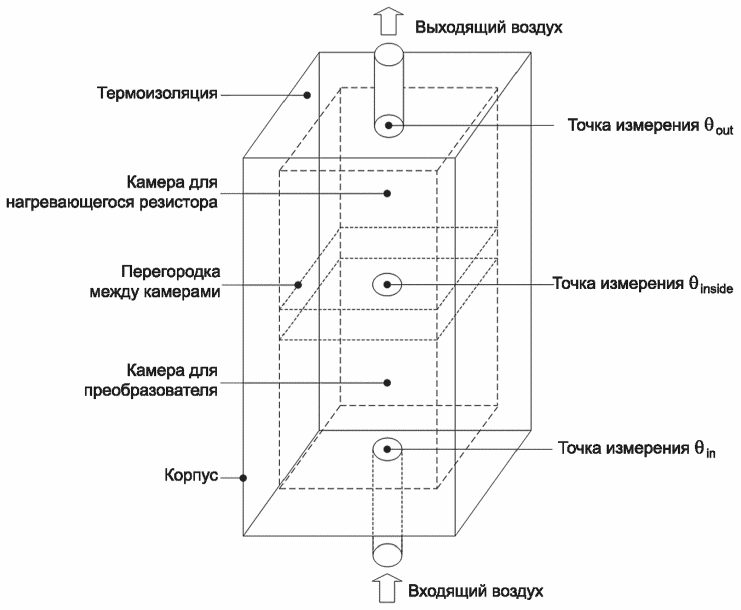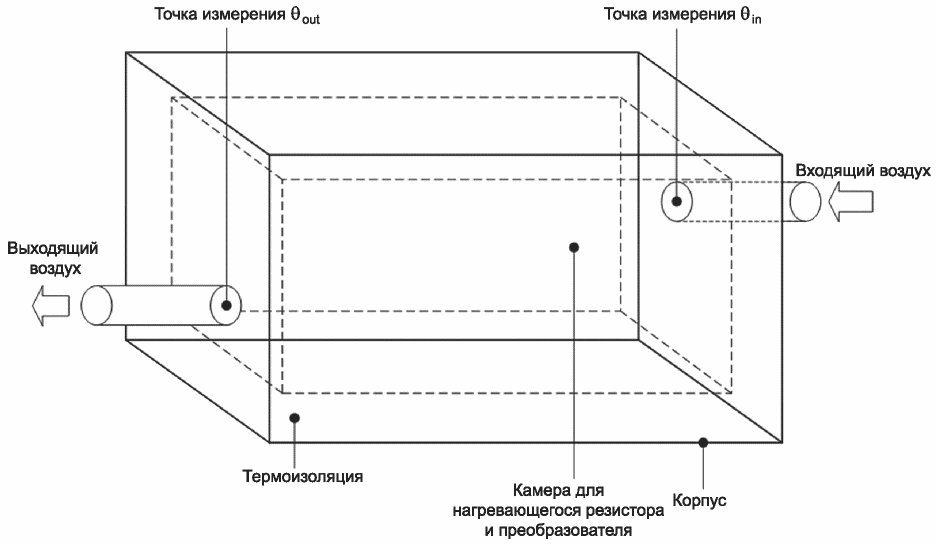 рисунке G.2. Она состоит из корпуса, вмещающего одну термоизолированную камеру, в которой поочередно размещены испытуемый преобразователь и нагреваемый резистор, функционирующие в одинаковом воздушном потоке. На 1-м этапе испытуемый преобразователь работает с определенной нагрузкой. При этом в установившемся состоянии теплового равновесия фиксируют температуры на входе и выходе калориметра и скорость воздушного потока. На 2-м этапе в камере размещают резистор, в который передают и измеряют такую мощность, чтобы в состоянии теплового равновесия температура на входе и выходе, а также скорость потока воздуха стали такими же, как и при нагреве преобразователя на 1-м этапе. Потери в преобразователе определяют по питающей мощности нагреваемого резистора по формуле