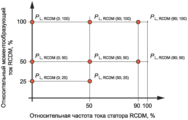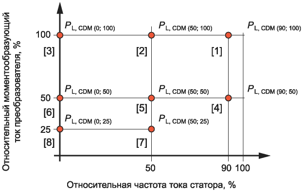 Для электропривода, приведенного в качестве примера, могли бы быть измерены потери реального двигателя. В настоящем примере использованы данные эталонного двигателя мощностью 7,5 кВт, приведенные в