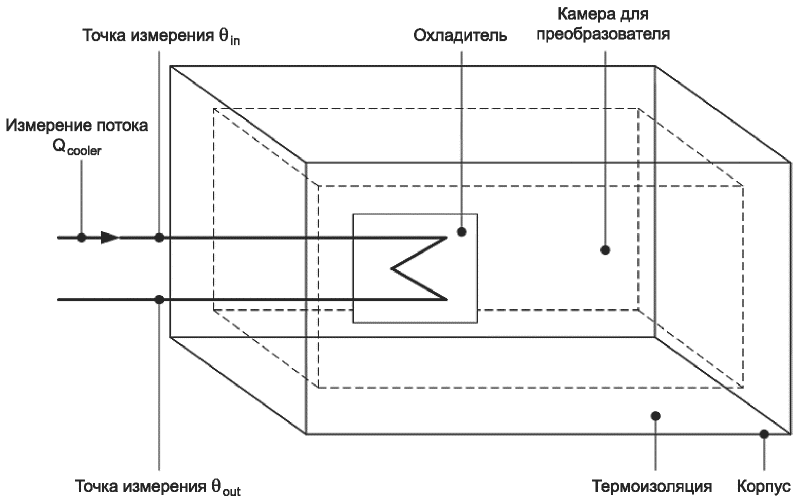рисунке G.3. Она состоит из корпуса, вмещающего одну термоизолированную камеру, через которую протекает хладагент, передающий тепло, выделяемое испытуемым преобразователем. Преобразователь работает в требуемом режиме, и в состоянии теплового равновесия измеряют объемный расход жидкости и температуры на входе и выходе из камеры. Выделенную преобразователем мощность рассчитывают по формуле