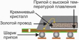 Корпус типичного компонента BGA состоит из нескольких слоев различных материалов: основы, заливки, кремниевого кристалла, столбиковых выводов из припоя C4, паяльной пасты и шариков припоя. На