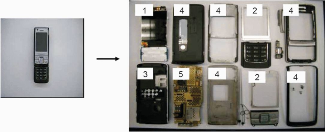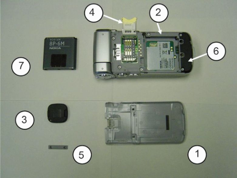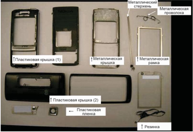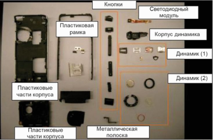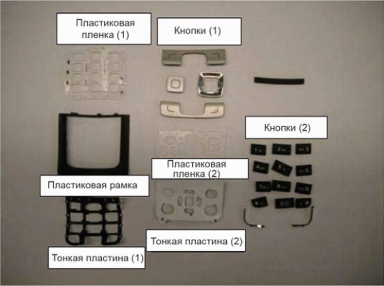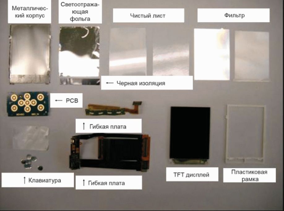 Подобным образом частичное разделение основной ПП данного сотового телефона на компоненты показано на