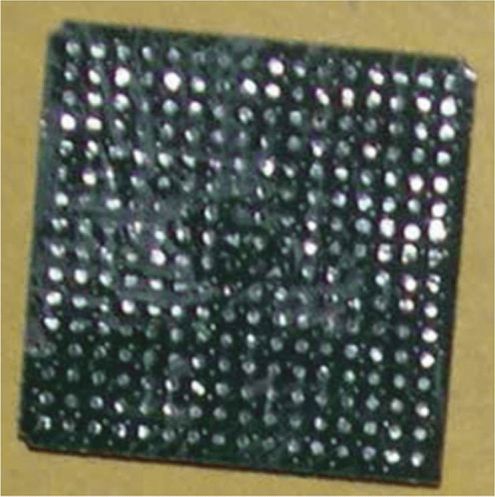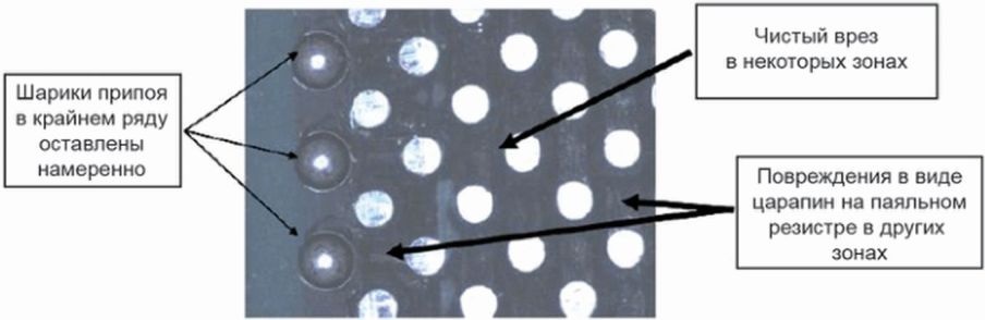 Некоторые шарики припоя можно было только срезать, тогда как другие просто "выскакивали" из корпуса, а не были срезаны или соскоблены. Как видно из рисунка E.11, шарики припоя не были отделены от корпуса, таким образом, который гарантировал бы, что был собран только материал шариков припоя.