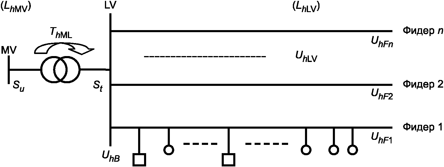 ThML - коэффициент передачи гармонического напряжения среднего/низкого напряжения порядка h; значение зависит от характеристик системы, уровня нагрузки и порядка гармоники.